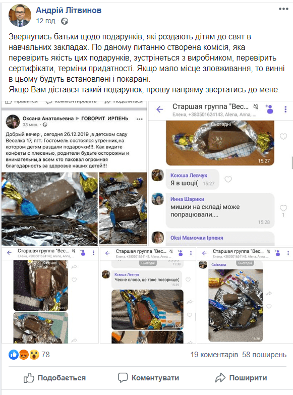 Мешканці Ірпеня з активною громадською позицією звернулися до місцевої влади з проханням прокоментувати дану проблему. На що в.о. мера Андрій Літвинов написав у своєму Facebook, що по даному питанню створять комісію, яка перевірит якість дитячих подарунків. Влада пообіцяла вирішити проблему з подарунками.