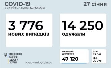 ​​3 776 нових випадків коронавірусної хвороби COVID-19 зафіксовано в Україні станом на 27 січня 2021 року. Зокрема, захворіли 115 дітей та 172 ...