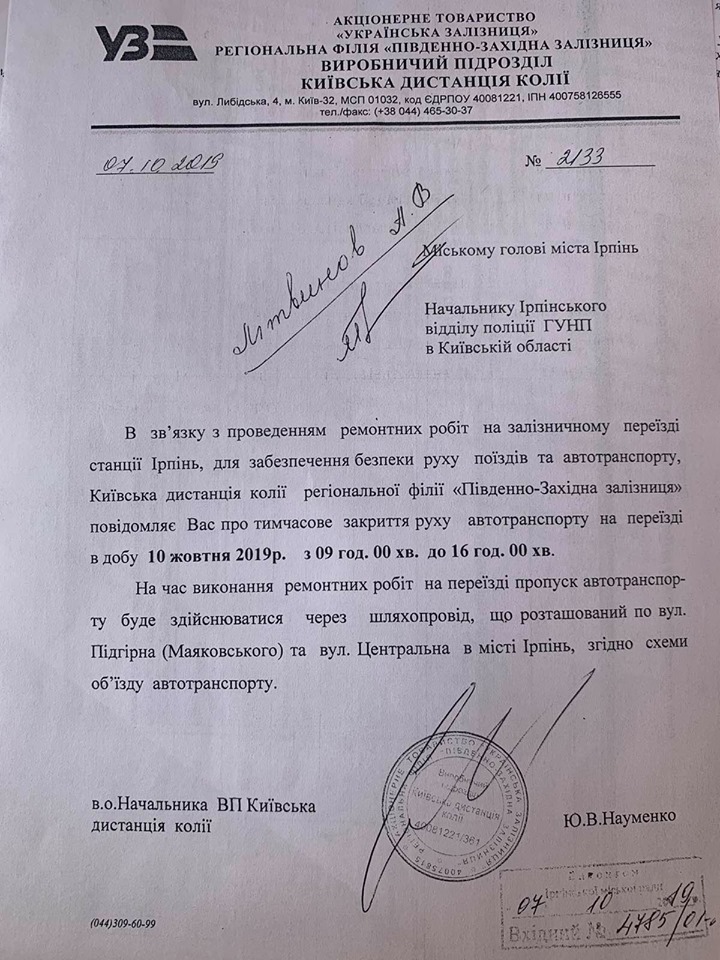 10   жовтня  з  9:00  до 16:00  залізничний  переїзд перекриють  у  зв’язку  з  проведенням  ремонтних  робіт.  Про це   йдеться у  відповідному повідомлення  від   АТ “Укрзалізниця”.