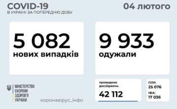 ​​5 082 нових випадки коронавірусної хвороби COVID-19 зафіксовано в Україні станом на 4 лютого 2021 року. Зокрема, захворіли 258 дітей та 220 ...