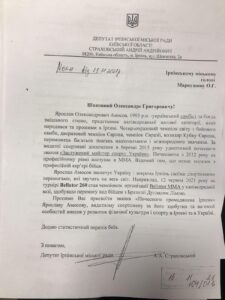 Депутат Ірпінської міської ради Андрій Страховський написав звернення очільнику міста Олександру Мркушину з проханням присвоїти звання Почесного громадянина міста Ірпінь спортсмену Ярославу Амосову. Про це він написав на своїй сторінці у Facebook.