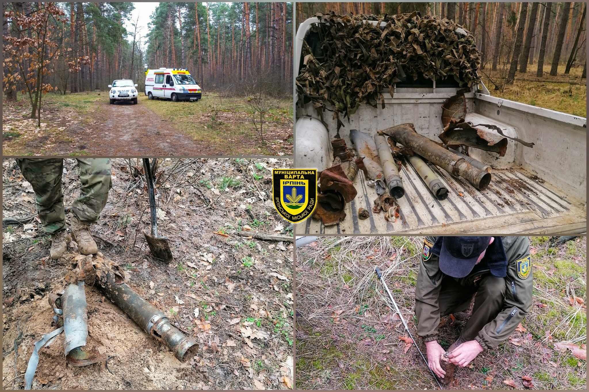 «Минулими вихідними сапери служби розмінування Муніципальної варти обстежували невелику ділянку Ірпінського лісу за рогом вулиці Київська і провулку Глінки. І хоча це були околиці лісу, тим не менш, навіть там було знайдено багато вибухонебезпечних предметів. Виялено залишки реактивних снарядів до РСЗВ «Град», некерованих авіаційних ракет, у тому числі з вибуховою речовиною», – йдеться у повідомленні.