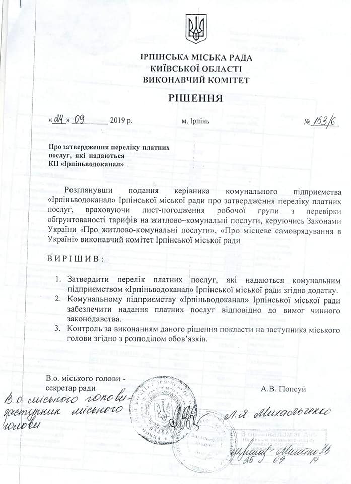 КП”Ірпіньводоканал” затвердило перелік платних послуг